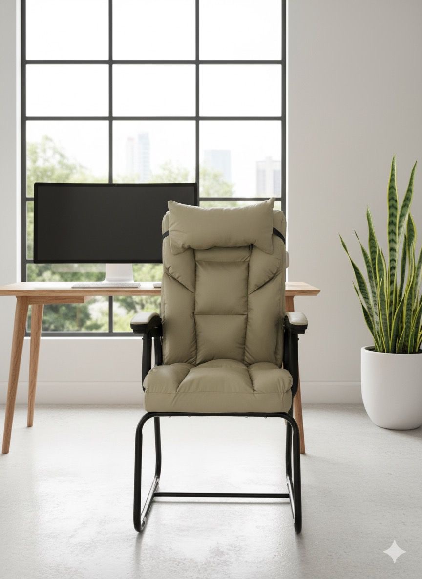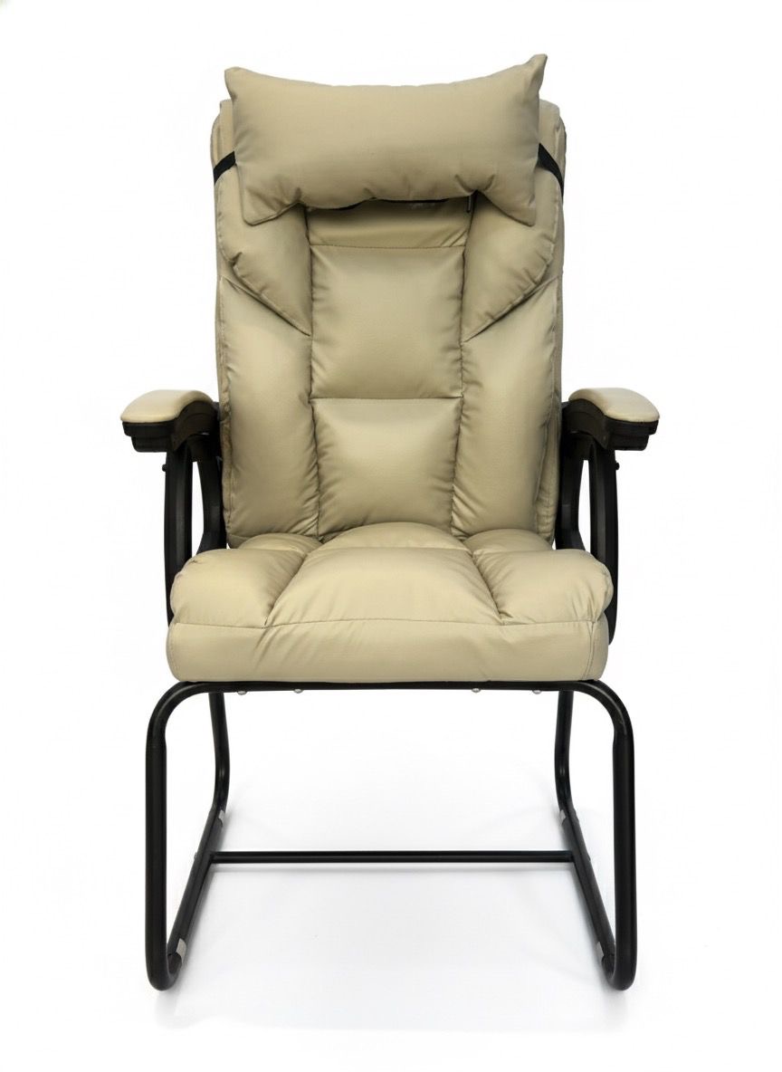This is a beige, high-back visitor’s or executive office chair with a padded headrest and armrests, on a black metal sled base.